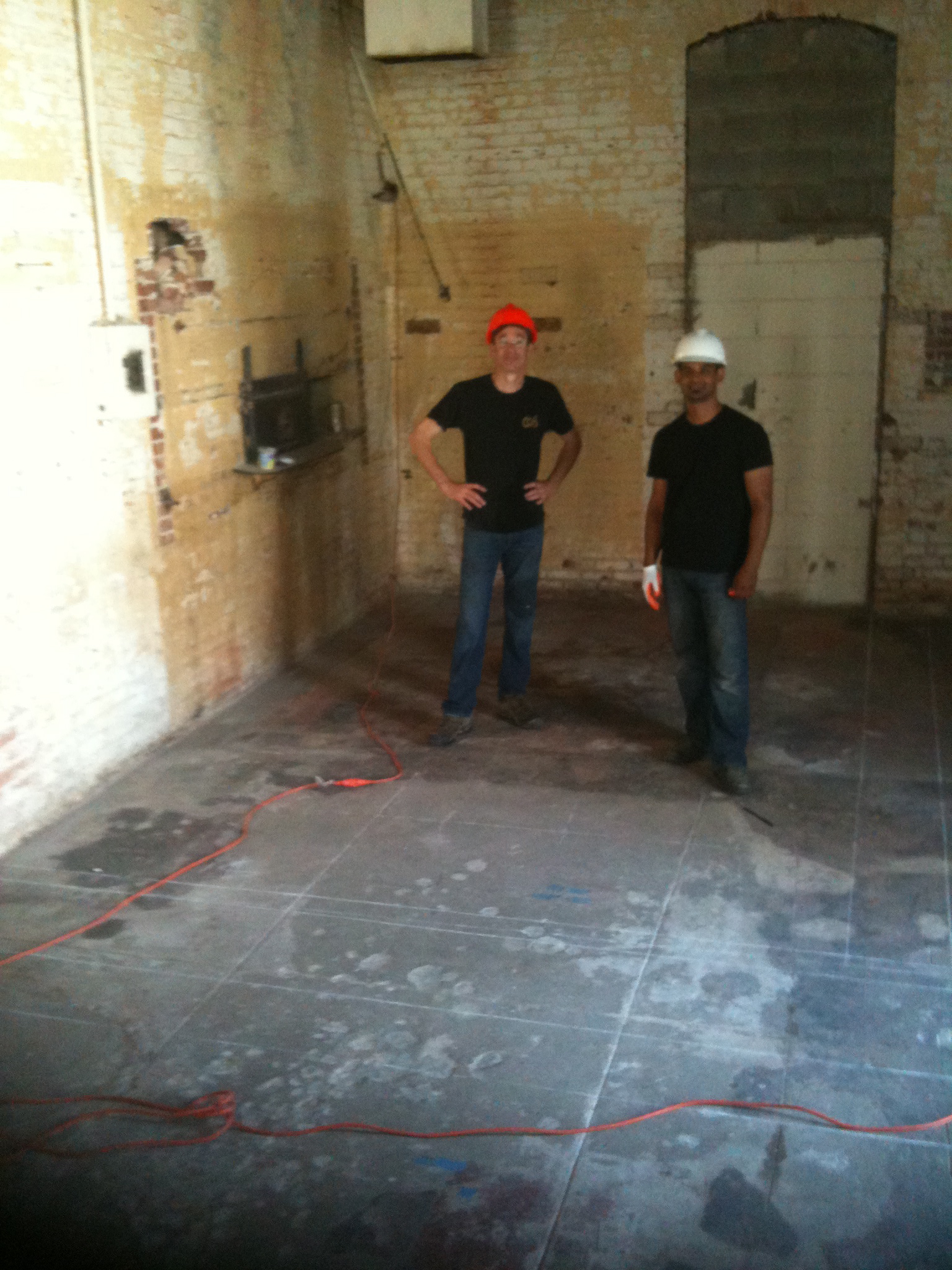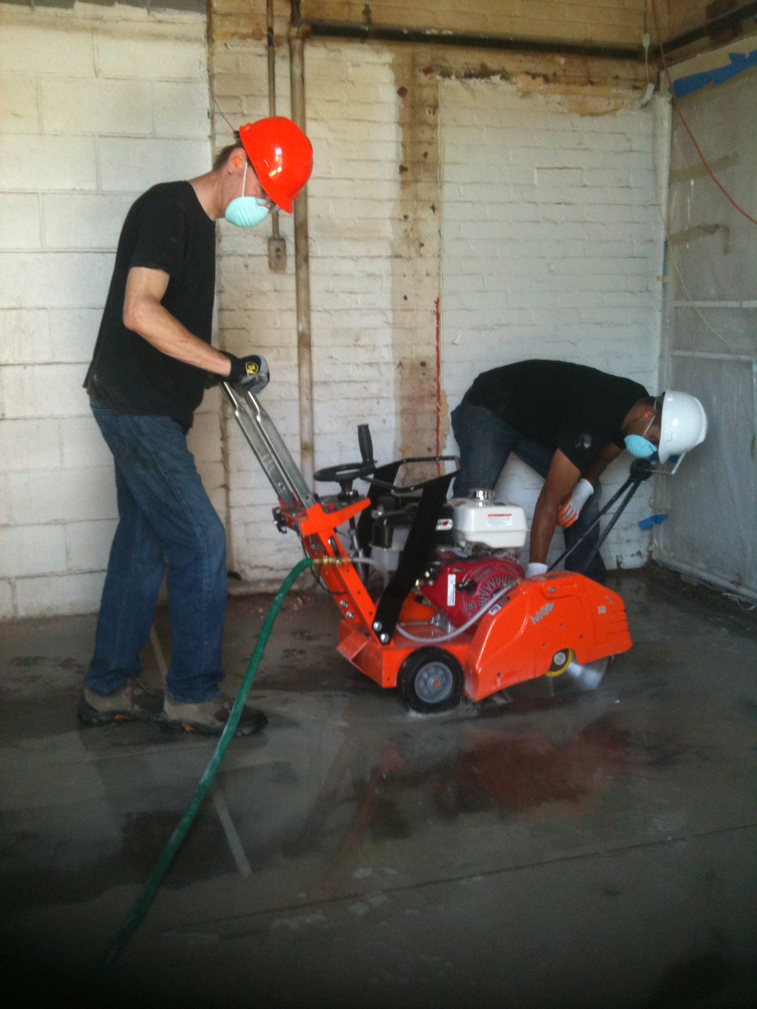After getting some comically large bids from contractors on putting in drain lines, Riaz and I once again went and rented the saw and started cutting the floor. This new saw was like butter! Got the whole job done in about 7 hours. The next day I pried up the concrete we cut and stacked the blocks. Monday I started digging.