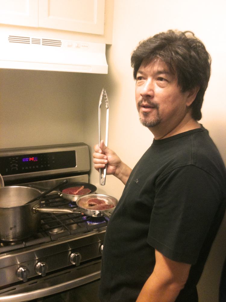 Like today for instance, Dean the representative of Paso Prime ranch (largest free range organic beef range in Cali) brought some samples for me to try. Since my stove isn’t hooked up yet my neighbor and colleague chef Andre (Maximilliano’s, Oinkster) was kind enough to host and cook! And damn can he cook.