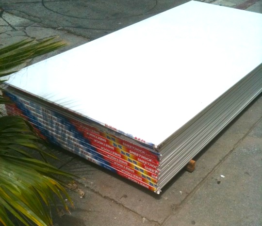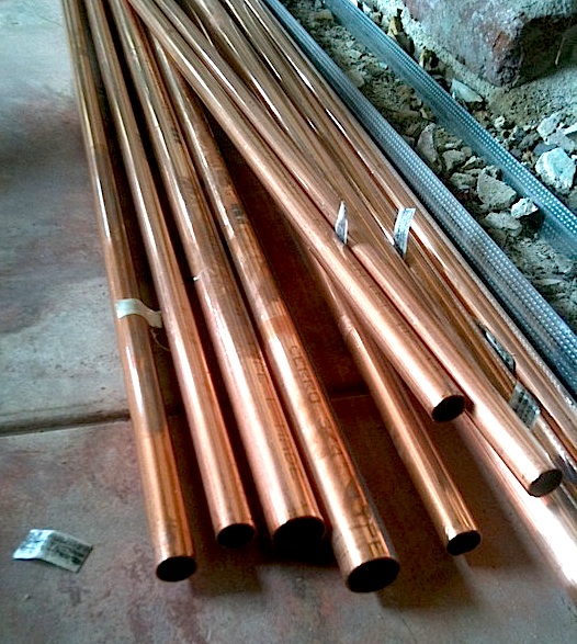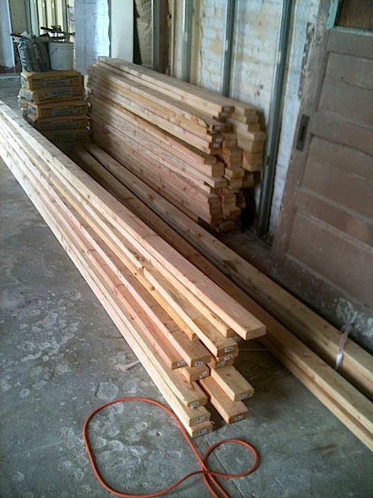 The building material arrived today!!! 50 sheets of 5/8 fire code drywall, 60 8′ 2×4’s, studs, jacks, headers, and cripples. 190 feet of copper pipe (type L, thank you), 100 ft of black iron pipe (gracious!). Truck arrived at 10:30 and unloaded with a fork lift.