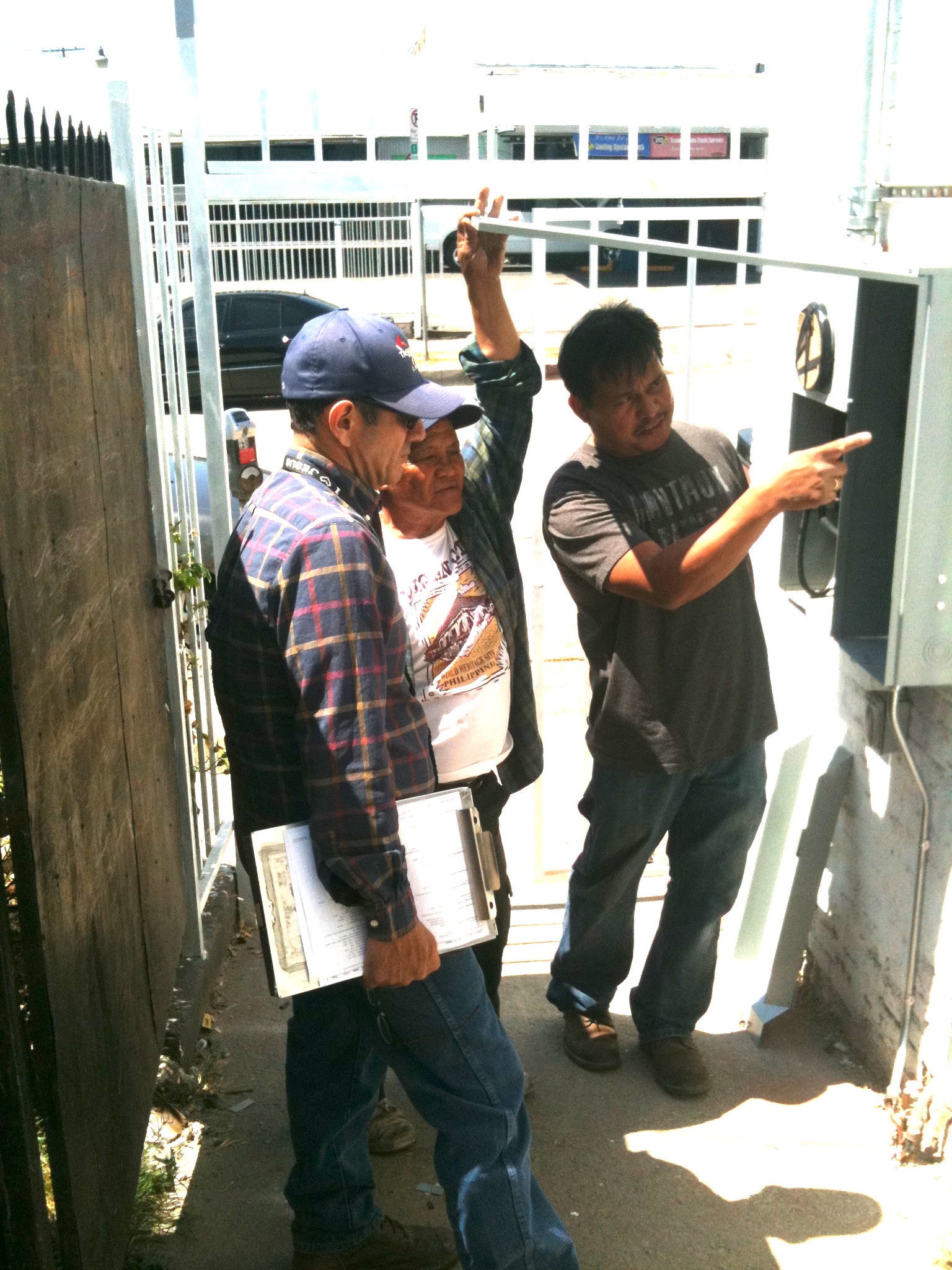 My electrician Roberto Orion Galarpe points to the expensive metal box for the inspector who is wearing an “I heart Jesus” lanyard.