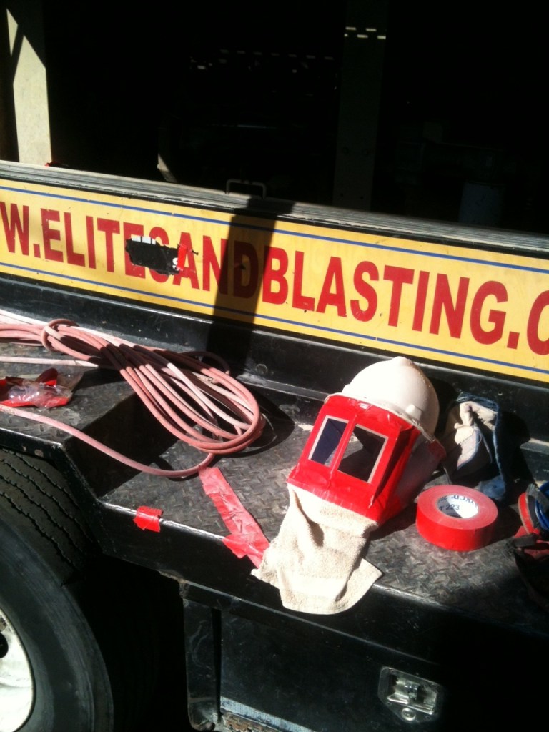 They showed up two days later with a 20′ ft long truck and a hopper of sand the size of Yuma. The three of them and myself spent two hours taping and wrapping to protect stuff, then they let this machine rip. It was without exaggeration the loudest thing I have ever heard in my life. The sound of a wind so strong it dissolves bricks in an instant is something to behold. The three took turns inside the room blasting, while the other two worked on the truck feeding sand into the compressor. I just stood outside agape looking at the cloud of dust covering the whole corner.