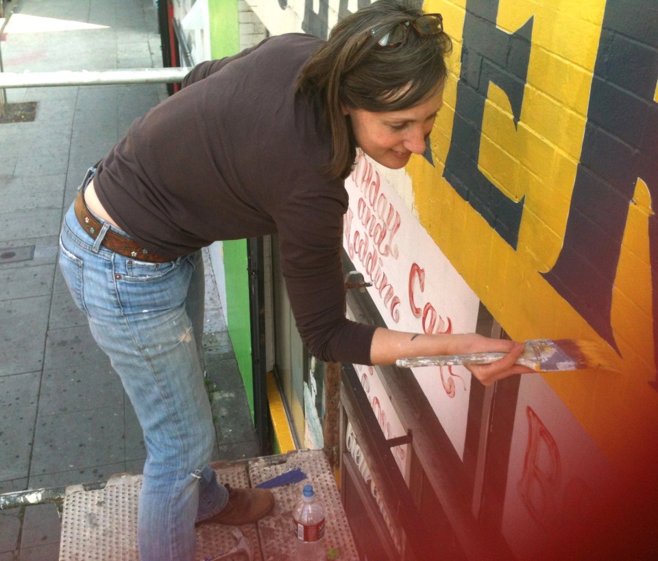 So Julia and I are painting their storefront in the colors they chose to show our admiration to the original Mom and Pop.